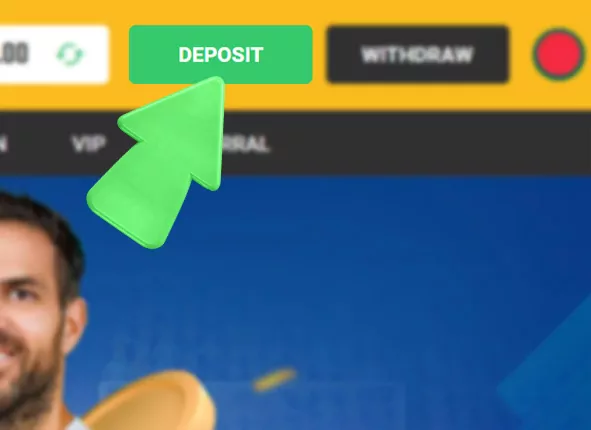 - “ডিপোজিট” অপশনটি বেছে নিন: সাইট বা অ্যাপে প্রবেশ করার পর, মূল পৃষ্ঠার “ডিপোজিট” বাটনে ক্লিক করুন।